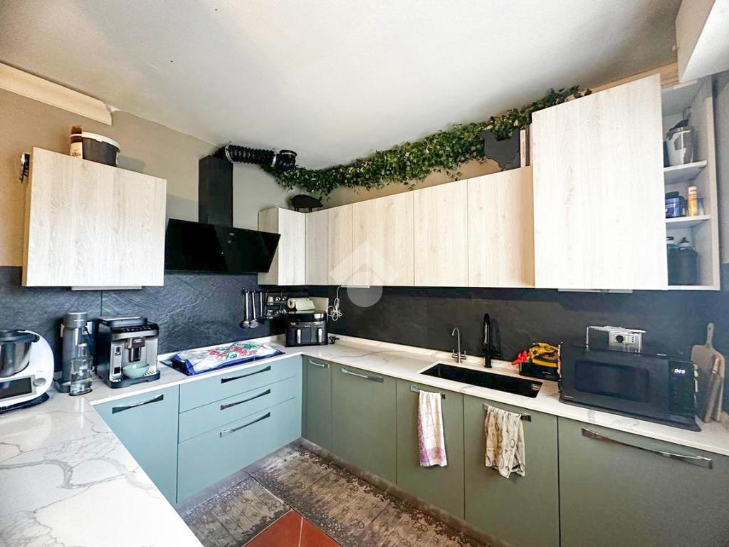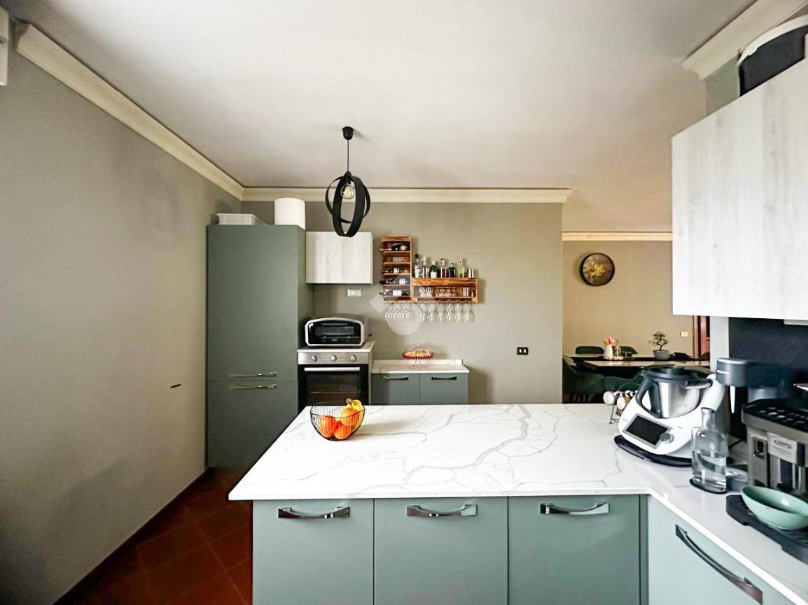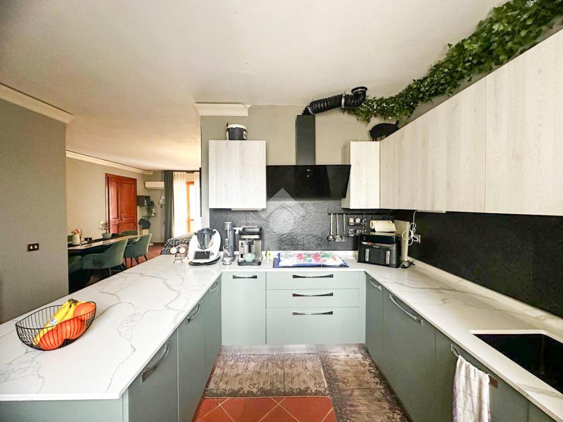 L’ingresso si apre su un ampio soggiorno dotato di camino e condizionatore, con accesso diretto al balcone, ideale per momenti di relax. La cucina è valorizzata da una spaziosa penisola, perfetta per chi ama vivere la zona giorno in modo conviviale e funzionale.